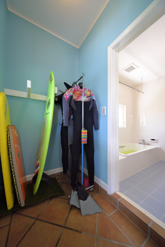 見た目の美しさと同じくらい重要なのが、日々のサーフィンをストレスフリーにする機能的な間取りです。Ocean Studioは、実際に趣味を楽しむ方の声を反映し、帰宅後の動線を徹底的に考えたプランニングを行います。砂がついたままの足でどこまで入れるか、重いロングボードをどこに収納するかといった、暮らし始めてから気づく細かなポイントを、プロの視点であらかじめ解消しておくことが重要です。